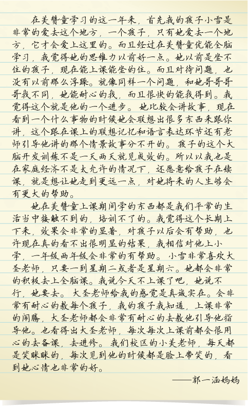 美赞童始终坚持培养一名孩子幸福3个家庭,为孩子一生负责,让家庭幸福美满!